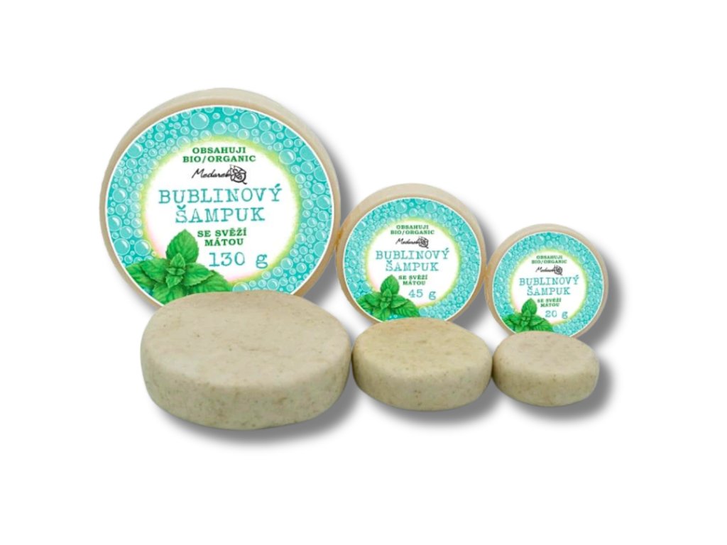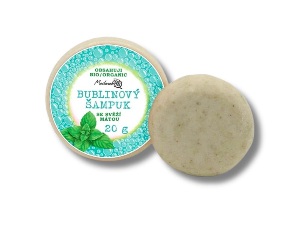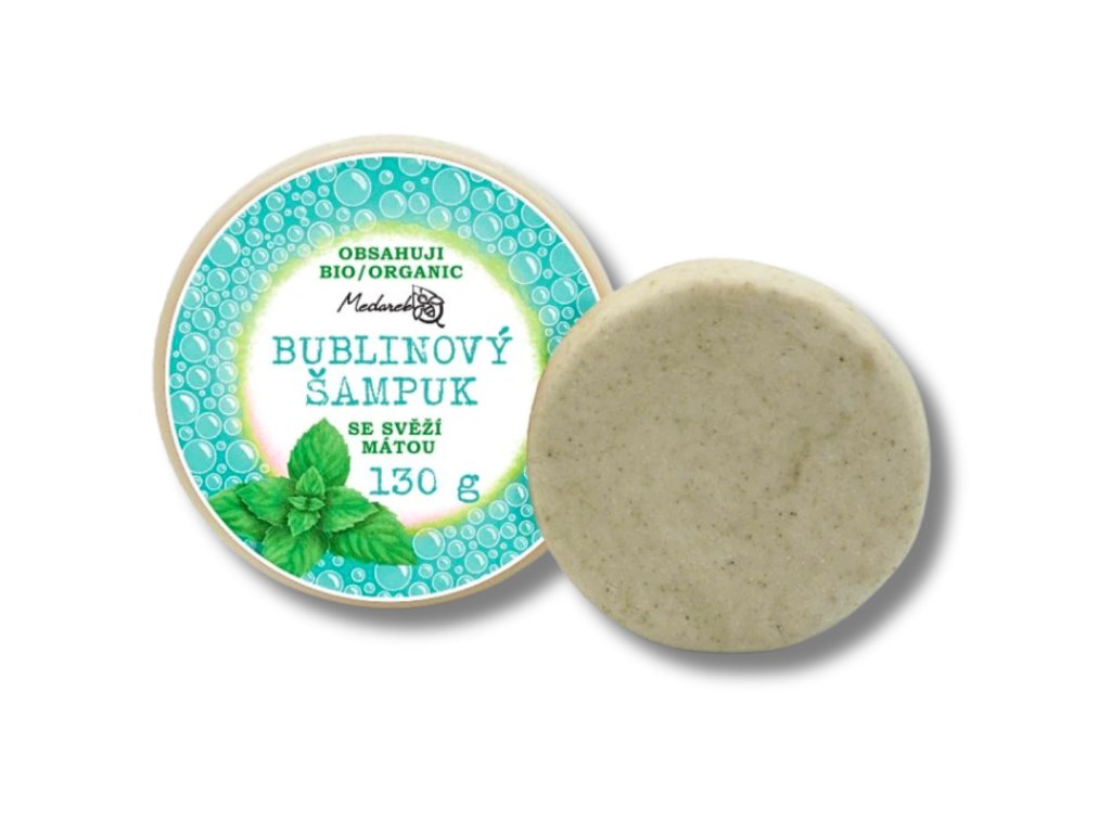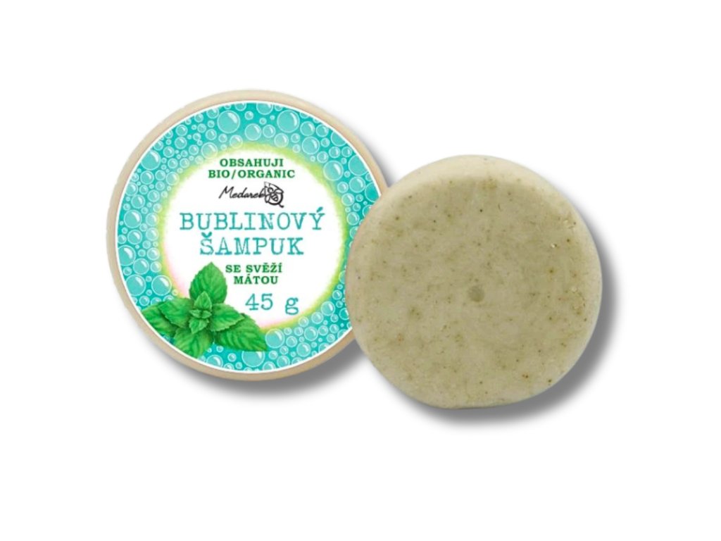 Bublinový šampuk se svěží mátou je jemný přírodní tuhý šampon s bio mátovým hydrolátem, cupuacu máslem a kaméliovým olejem pro normální až mastné vlasy dospělých i dětí od tří let. Vytváří bohatou pěnu, šetrně čistí pokožku hlavy, pomáhá regulovat maz a je vhodný i pro vlasy se sklony k lupům.