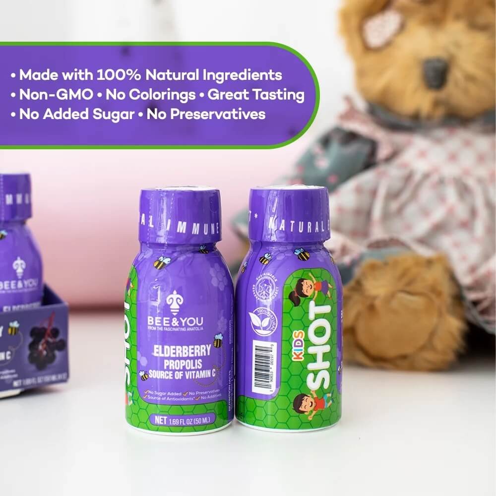 Dětský shot na imunitu – propolis, černý bez, vitamin C denní prevence • slazeno raw medem a karobem • obohaceno o zinek a vitamin D3