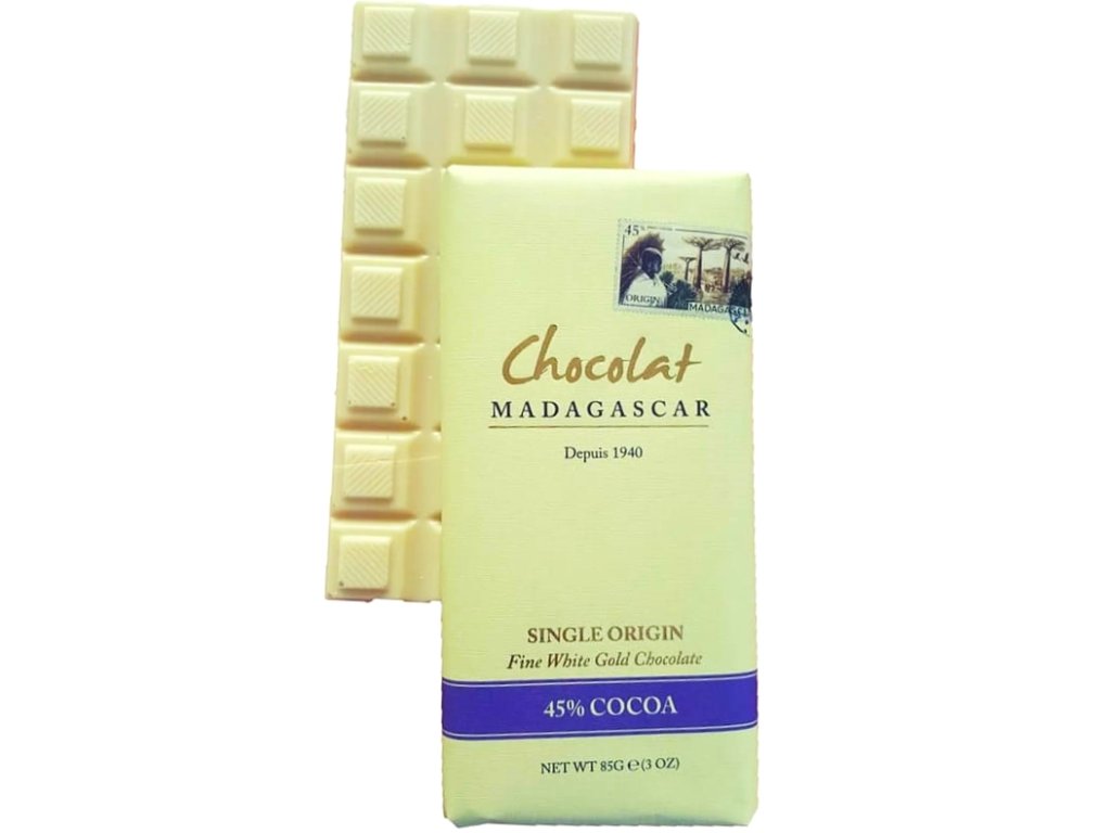 Introducing the luxury white chocolate "White Gold" with 45% cocoa content from Chocolat Madagascar. This delicious treat is made from cocoa butter grown in the Sambirano Valley of Madagascar and offers a complex flavour with notes of flowers, honey and banana. Free of palm fat and gluten, it is ideal for vegetarians, pregnant women, nursing mothers and children. A great gift for Mother's Day, Easter or Christmas 2023. The package contains 85 g of this exclusive delicacy.
