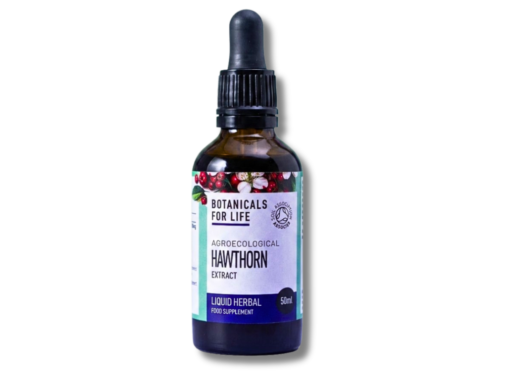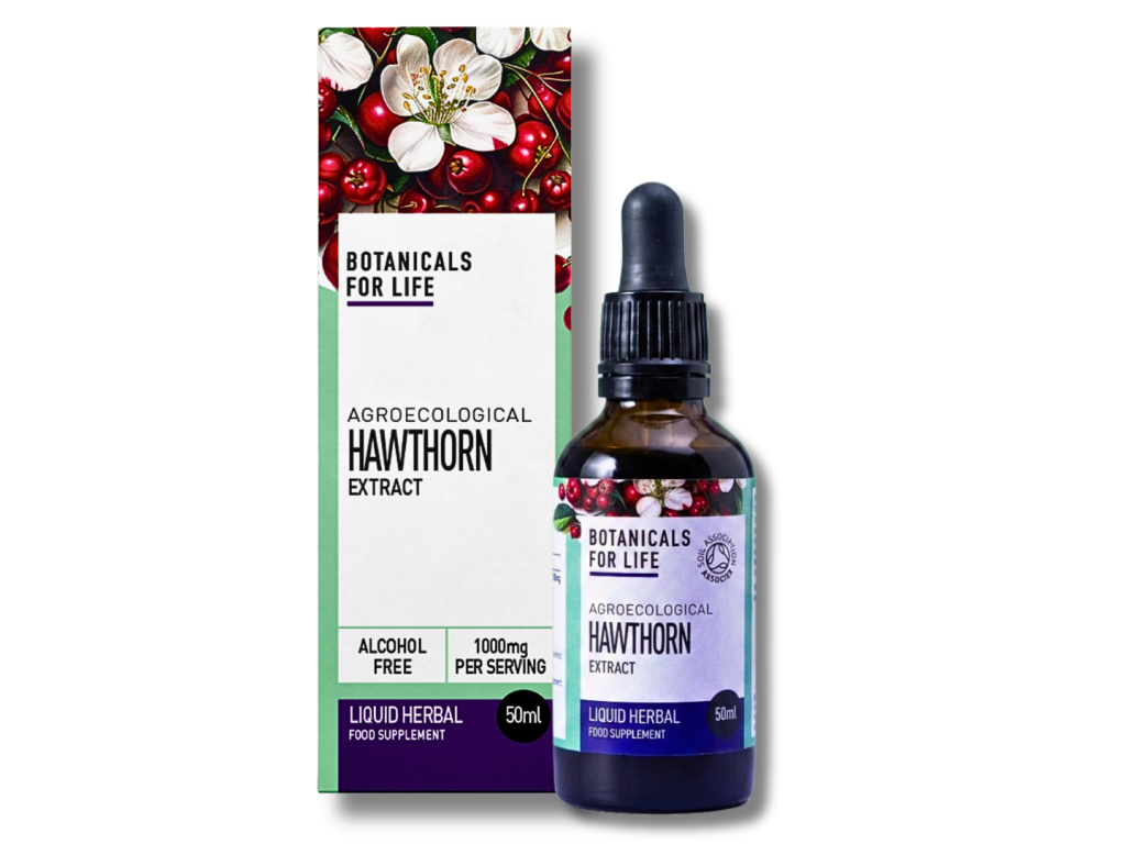 Botanicals For Life offers hawthorn as an agro-ecological alcohol-free 1:1 extract in liquid form. 1 ml (approx. 20 drops) corresponds to 1000 mg of hawthorn extract; the base consists of vegetable glycerin from coconut and purified water, making it an alcohol-free alternative to traditional tinctures. The bottle contains approximately 50 servings and the product is suitable for vegans.