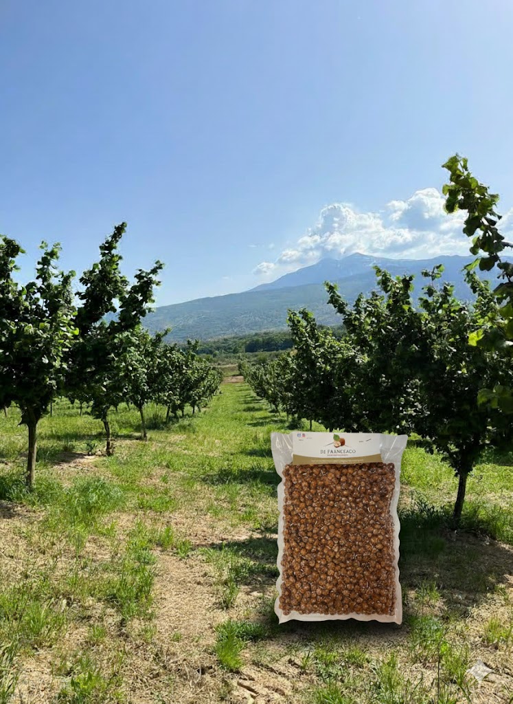 Processing takes place directly at the farm of Di Francesco Concetto, where the hazelnuts are hand-picked and lightly roasted in a small stone cottage among the hazelnut trees. This approach preserves the freshness of the harvest, supports local farmers and ensures a traceable origin of the raw material.
