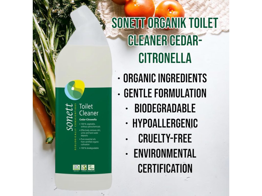 Toilet cleaner cedar - citronella by Sonett is designed for effective removal of dirt, urine and calcium deposits from toilet bowls. Plus, it's environmentally safe and suitable for anyone who cares about a healthy home and planet.