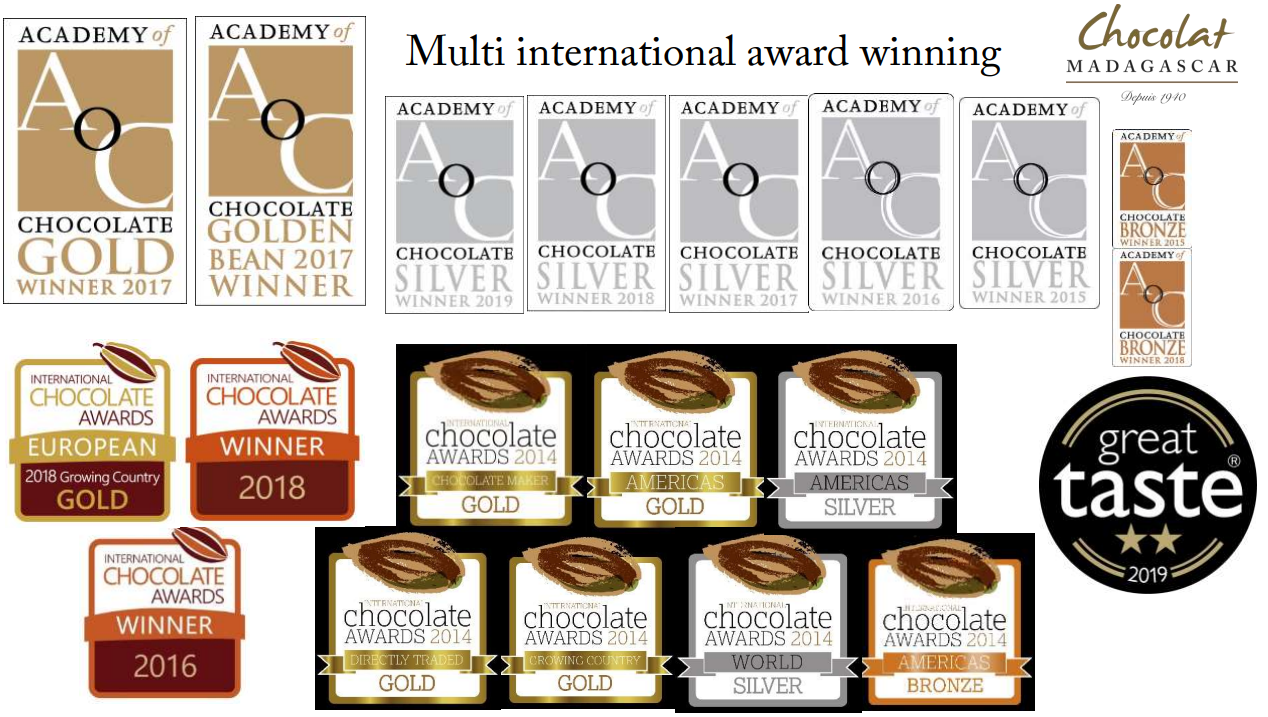 O kvalitě někdy není potřeba dlouze mluvit – v případě čokolád Chocolat Madagascar mluví za vše výsledky. Tato tree to bar čokoláda z Madagaskaru získala v posledních letech desítky mezinárodních ocenění, včetně absolutních vítězství v soutěži Golden Bean Award (např. 2017 a 2020) a speciálního ocenění Shining Bright Award.