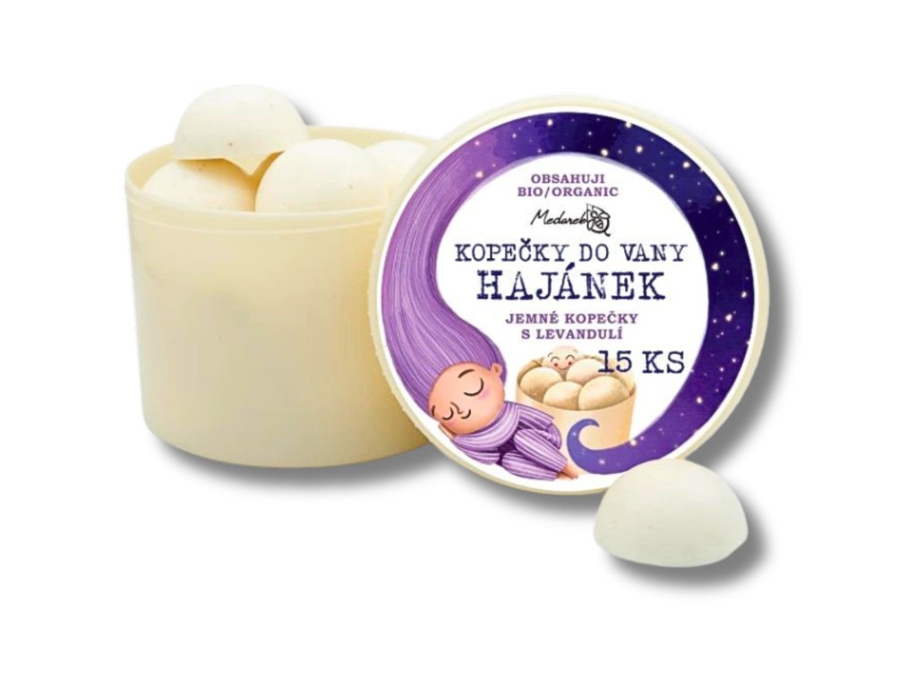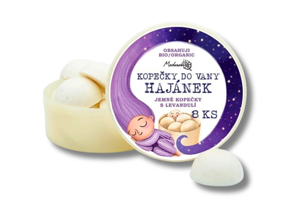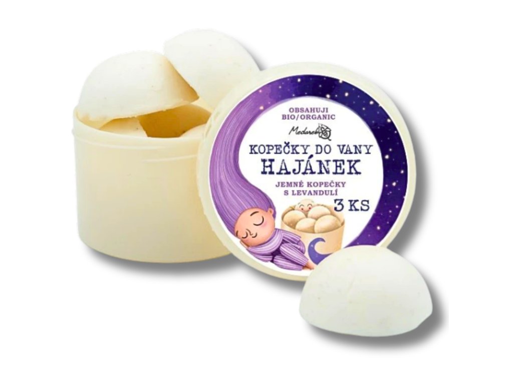 Kopečky do vany Hajánek – pro děti od narození jsou pečující kopečky do koupele s jemnou levandulovou vůní a se 100% přírodním složením z mangového másla, mandlového oleje a pravěké soli z Utahu. Většina klíčových složek je v bio kvalitě (90 % surovin bio).