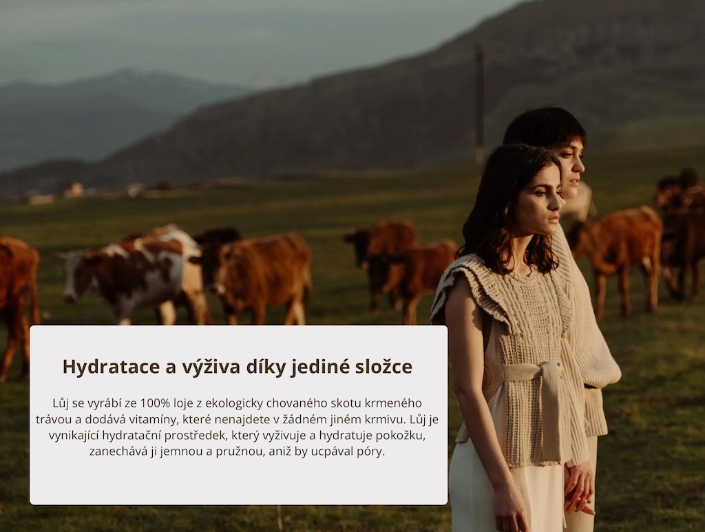 Hlavní složkou kosmetiky je hovězí lůj, který se skládá ze 100% loje z ekologicky chovaného dobytka krmeného trávou a poskytuje vitamíny, které se nenacházejí v žádném jiném krmivu. Lůj je vynikající hydratační prostředek, který vyživuje a hydratuje pokožku, zanechává ji jemnou a pružnou, aniž by ucpával póry.