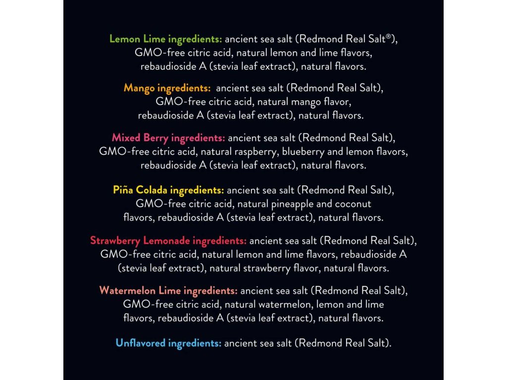Pravěká mořská sůl Redmond Real Salt® (podzemní ložisko), nemodifikovaná kyselina citronová, přírodní příchutě maliny, borůvky a citronu, rebaudiosid A (extrakt ze stévie), přírodní příchutě.