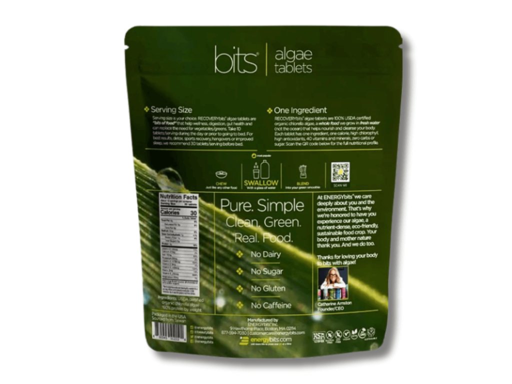 ENERGYbits® vede Catharine Arnston; tablety jsou <strong-*****>jednosložkové (100 % spirulína nebo 100 % chlorella) bez plnidel, cukru a aditiv, řasy se pěstují v Tchaj-wanu ve venkovních sladkovodních nádržích s trojitě filtrovanou pramenitou vodou, a každá šarže prochází dvojím testováním včetně ověření v USA v FDA-approved laboratoři.