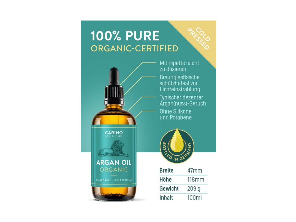 Spoločnosť Woldohealth/ Carino vyrába arganový olej len z nepražených jadierok argánie tŕnistej, ktorá pochádza z Maroka. Neobsahuje žiadne prísady, ako sú silikóny, PEG, parabény, vonné látky, minerálne oleje ani mikroplasty. Je balený vo fľaši z tmavého skla, ktorá poskytuje ochranu pred UV žiarením a predlžuje jeho optimálnu trvanlivosť. Súčasťou balenia je aj kalibrovaná lekárska pipeta na presné dávkovanie. Olej sa vyrába a farmaceuticky testuje v Nemecku, bez prísad a s certifikátom BIO. Vhodné pre vegánov a vegetariánov.