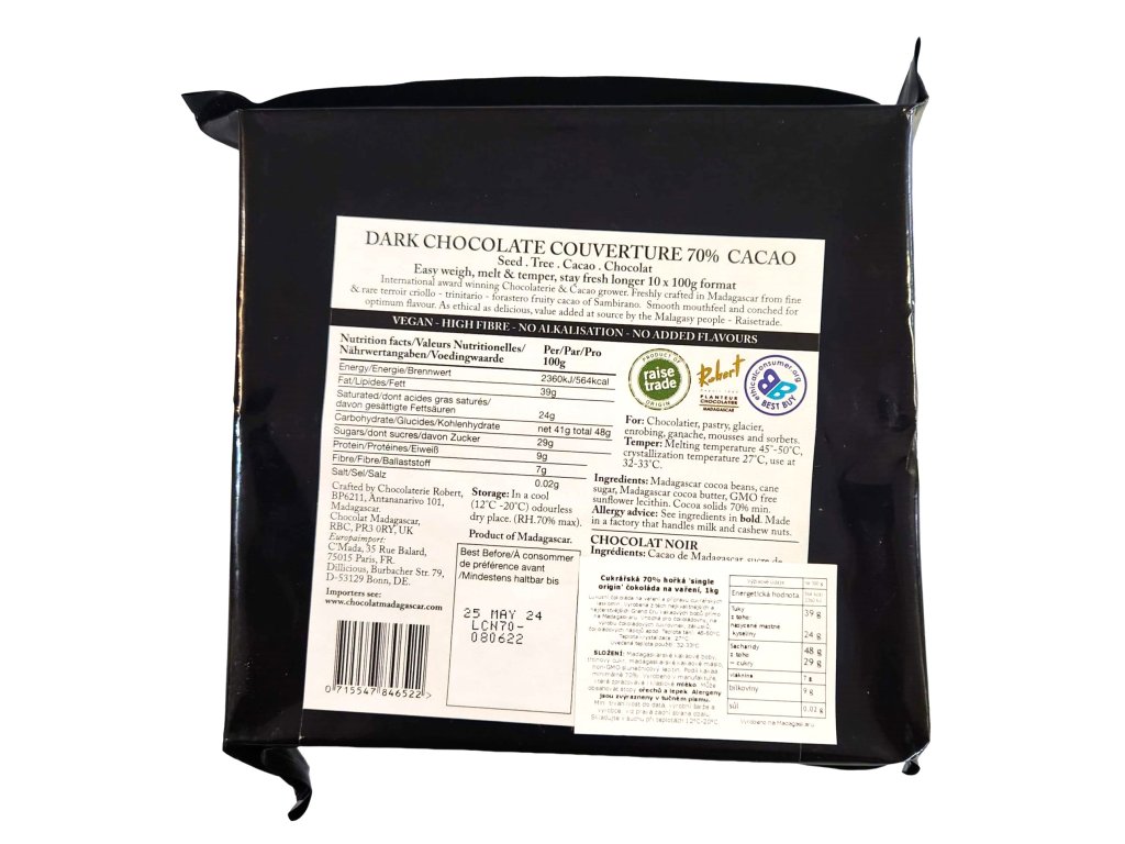 Vysokopercentná cukrárska tmavá čokoláda na pečenie a varenie od značky Chocolat Madagascar so 70 % obsahom špeciálnych a oceňovaných kakaových bôbov Grand Cru de Sambirano, sladená surovým trstinovým cukrom z oblasti Ampasimanolotra.