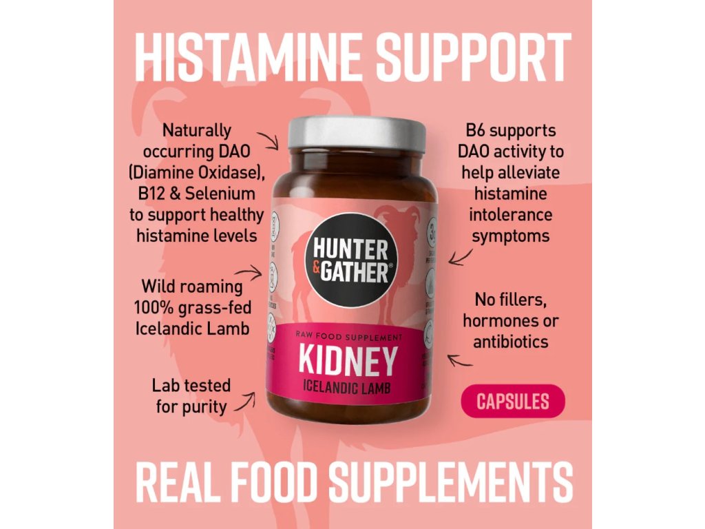 - Doplňte DAO prirodzene - mrazom sušené jahňacie obličky Hunter & Gather sú bohatým zdrojom enzýmu DAO, ktorý pomáha odbúravať histamín.