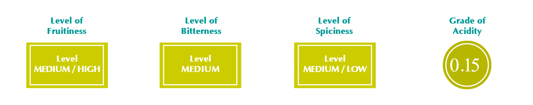 Jednodruhový organický extra panenský olivový olej odrody Picual lisovaný za studena má nízku kyslosť, vysoký obsah polyfenolov a intenzívne organoleptické vlastnosti. Má stredne ovocnú chuť.