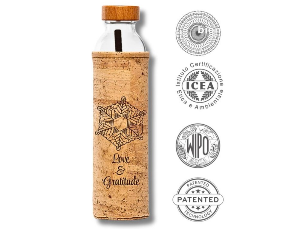 Skleněná láhev na vodu Láska & Vděčnost korkový obal • restrukturalizace vody • programované sklo • 0,5 l