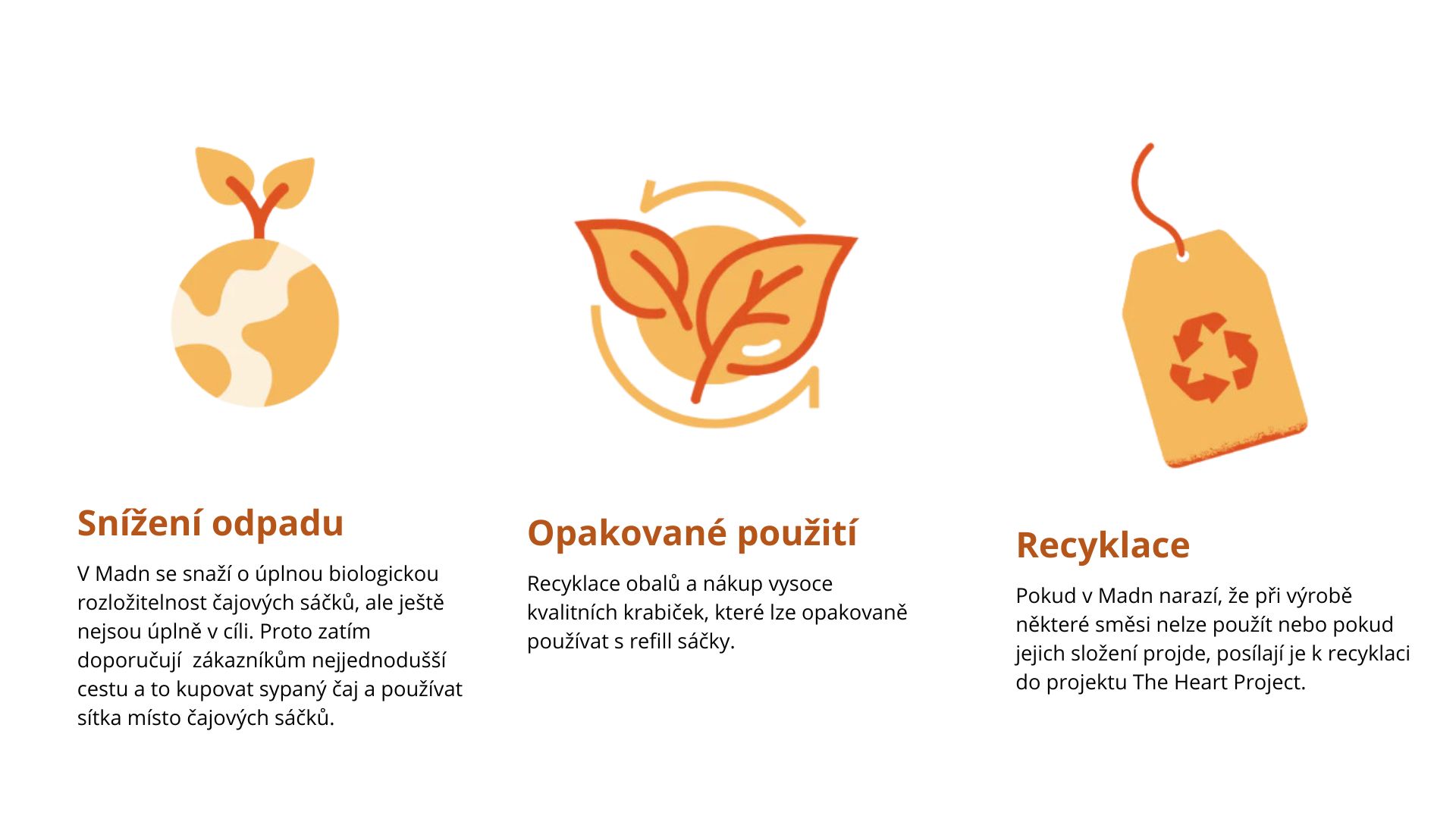Madn preferuje sypaný čaj a nabízí praktická refill balení, která snižují odpad a usnadňují skladování. Důraz na kvalitu surovin a pečlivé ruční míchání provází celý proces od pole až po šálek.