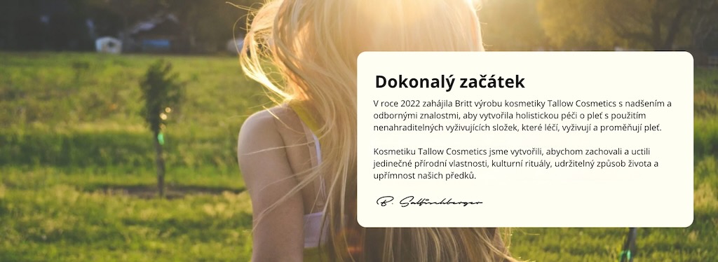Britt (zakladateľka spoločnosti Tallow Cosmetics) potom usilovne pracovala na znovuobjavení legendárnej a regeneračnej sily loja. Za svoj úspech vďačí absolútnej oddanosti zvládnutiu remesla pomalej a rafinovanej extrakcie a starostlivému výberu liečivých rastlín a prírodných zložiek.